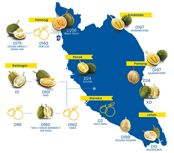 在馬來(lái)西亞,大約有200個(gè)榴蓮品種有自己獨(dú)特的風(fēng)味和香氣。同時(shí)它們也對(duì)適宜的生長(zhǎng)條件也特定的需要,例如降雨,海拔,溫度和土壤結(jié)構(gòu)。榴蓮僅在成熟季節(jié)才有供應(yīng)那發(fā)生在每年的六月和七月。那個(gè)時(shí)節(jié)成熟后從樹上自然掉落的榴蓮,往往會(huì)含有較多的果肉和更濃郁的香氣。